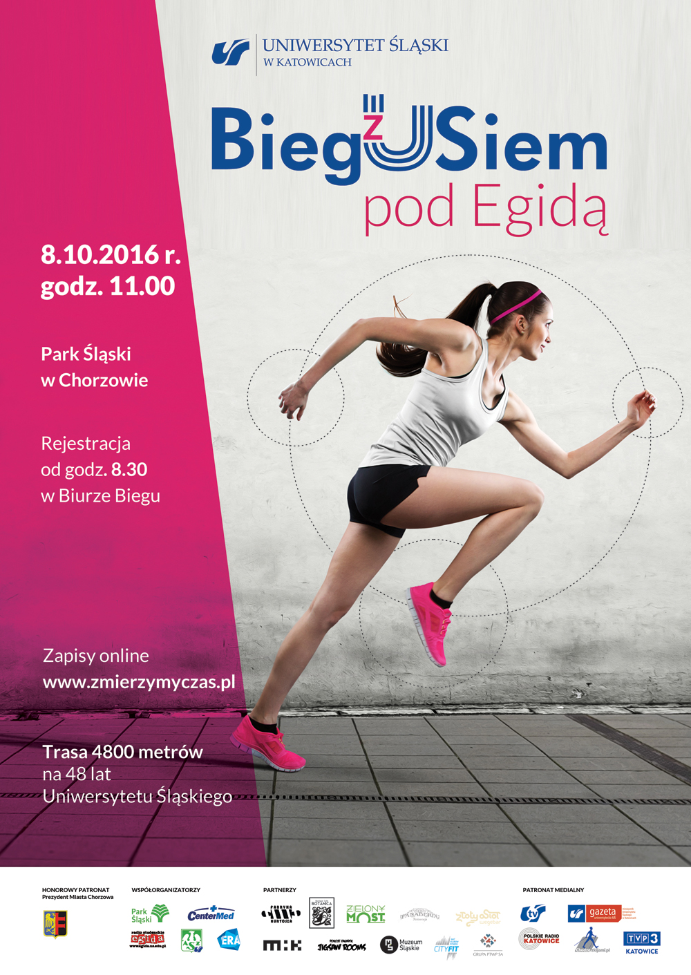 W sobotę 8 października 2016 r. w Parku Śląskim odbędzie się trzecia edycja wydarzenia „Bieg(z)Usiem pod Egidą” – wspólnej inicjatywy Uniwersytetu Śląskiego i partnerów. To symboliczny bieg na dystansie 4,8 km zorganizowany z okazji 48. urodzin Uniwersytetu Śląskiego. Trasa będzie przystosowana do potrzeb osób niepełnosprawnych i amatorów nordic walkingu. Start biegu zaplanowany został na godz. 11.00 przy hali „Kapelusz”. Osoby zainteresowane uczestnictwem proszone są o dokonanie rejestracji poprzez stronę internetową i uiszczenie opłaty startowej w wysokości 10 złotych. Osoby niepełnosprawne i słuchacze Uniwersytetu Trzeciego Wieku są zwolnieni z opłaty. W Biurze Biegu, które czynne będzie w dniu imprezy w godz. od 9.00 do 10.30, przeprowadzona będzie weryfikacja uczestników na podstawie dokumentów tożsamości. Tam też zawodnicy odbierać będą numery startowe. W wydarzeniu mogą wziąć udział jedynie osoby pełnoletnie.